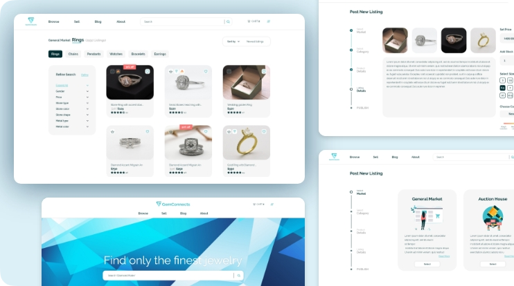As a Product Designer and Brand Identity Designer for GemConnects, I designed both the e-commerce and auction sections of the platform for buyers and sellers. I took a user-centered approach, conducting research to understand the needs and pain points of both users. I then designed wireframes, prototypes, and high-fidelity mockups to test and refine the user experience. I also worked with developers to ensure that the design was implemented smoothly. My deliverables included: